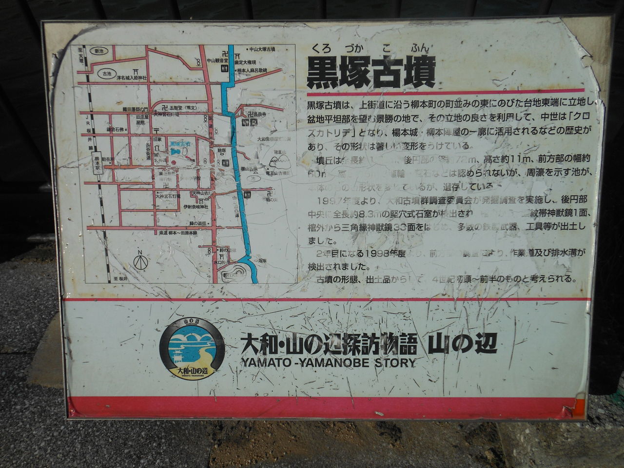 そうこうしているうちに、左手に黒塚古墳(奈良県・天理市)が見えてきました。 近くにあった黒塚古墳の案内板。写真をクリックすると大きな写真で確認できます。 かすれていて読めない。。