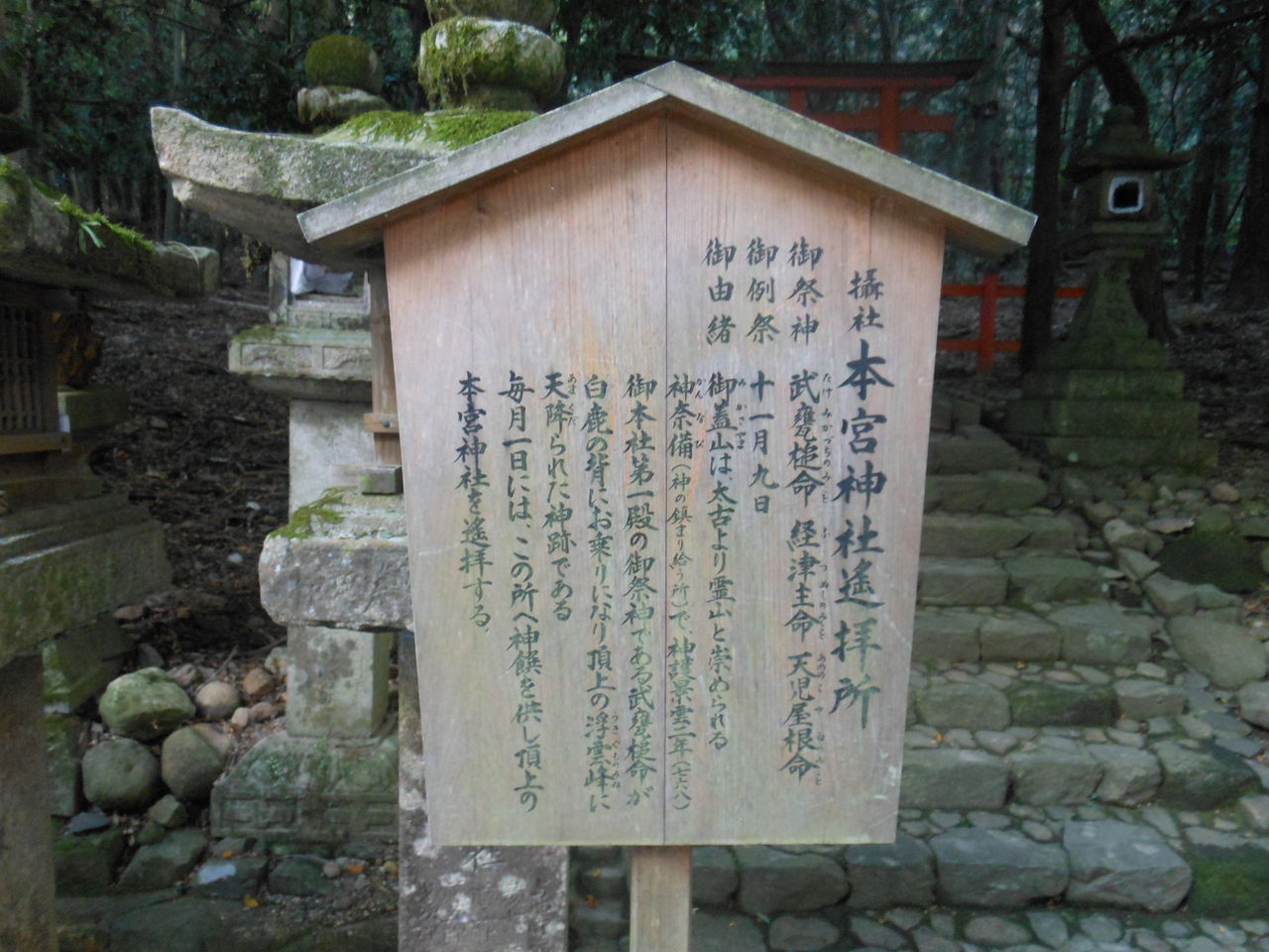 春日大社の回廊。 春日大社の摂社・末社への参道。 少し行くと本宮神社遥拝所。 本宮神社遥拝所のご由緒。写真をクリックすると大きな写真で確認できます。 ここからは遙か先の御蓋山(みかさやま)の頂、浮雲の峰にお祀りされている本宮神社(ほんぐうじんじゃ)を拝むことができます。