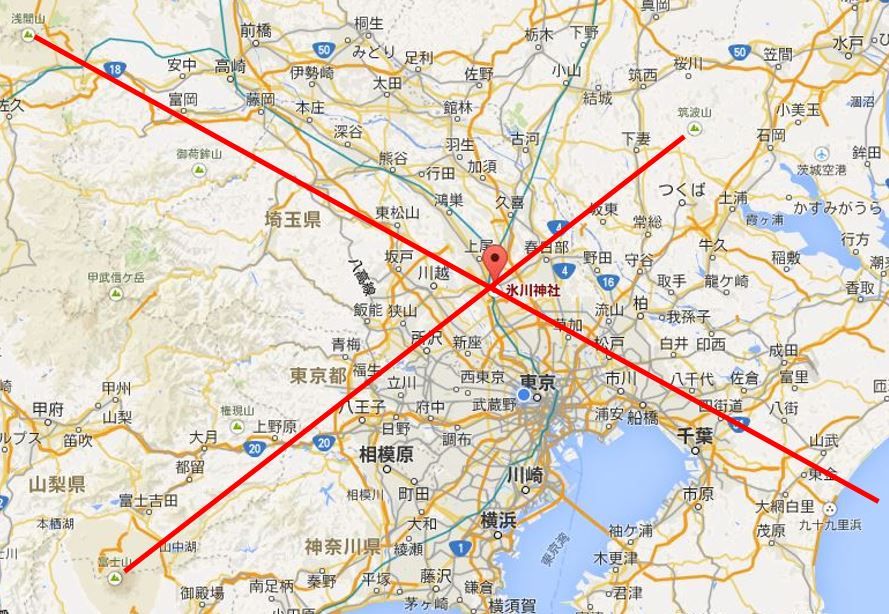 さらにそれを伸ばすと、浅間山まで伸び、その二つのラインが交差する点上に当社が存在する、という指摘がある(戸矢学『富士山、2200年の秘密』)。