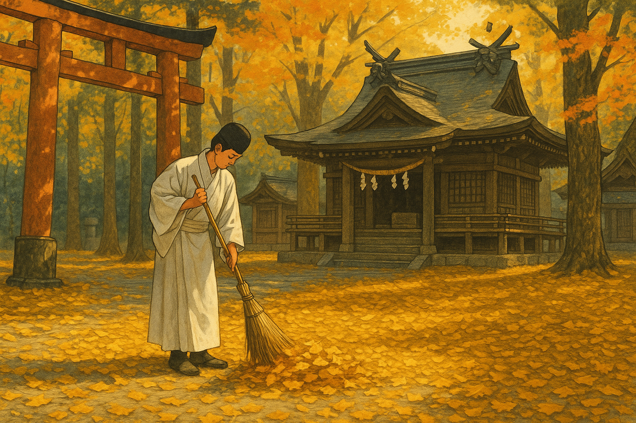 秋の神社では、落ち葉の掃き清めが欠かせない。それは単なる美化活動ではない。“祓(はらえ)”の実践そのものなのだ。